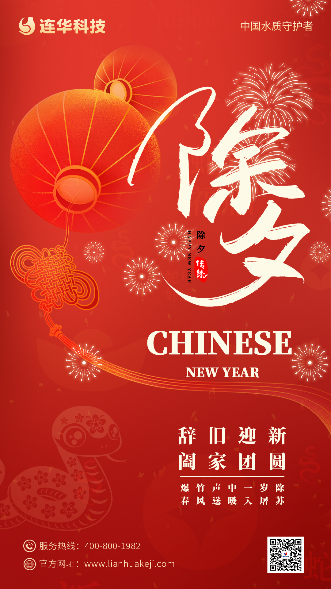 旧岁的余晖 渐渐隐没于时光的幕后 新的一年 携着新生的憧憬与希冀翩然而至 除夕佳节 连华科技全体员工恭祝大家 蛇来运转巳巳好 心想事成步步高 家庭幸福美满 生活平安喜乐