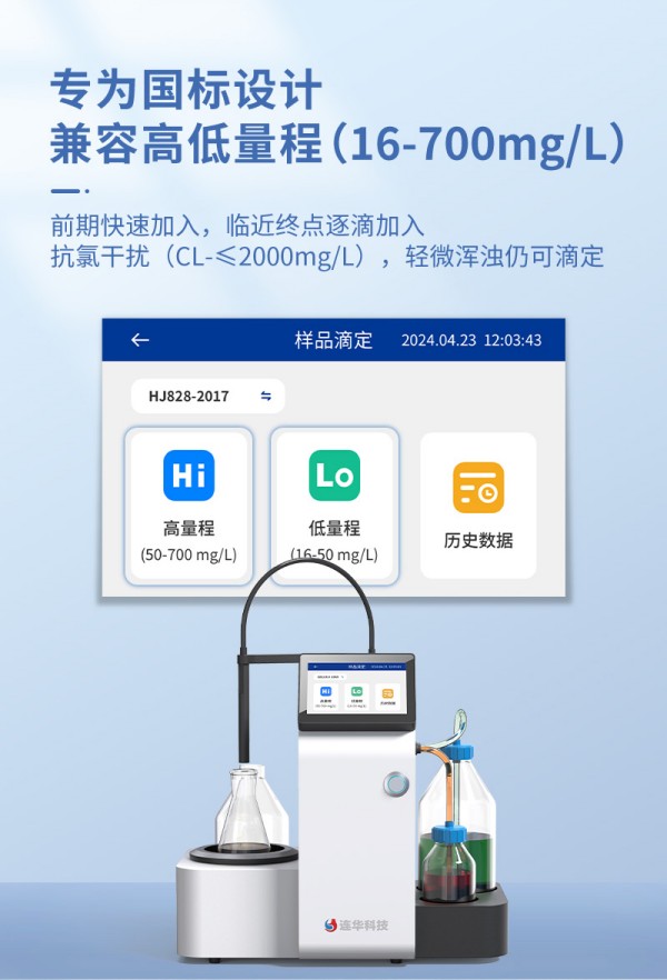 LH-JA100采用光学颜色识别原理,专为CODcr国标法优化设计,可自动完成滴定全流程: