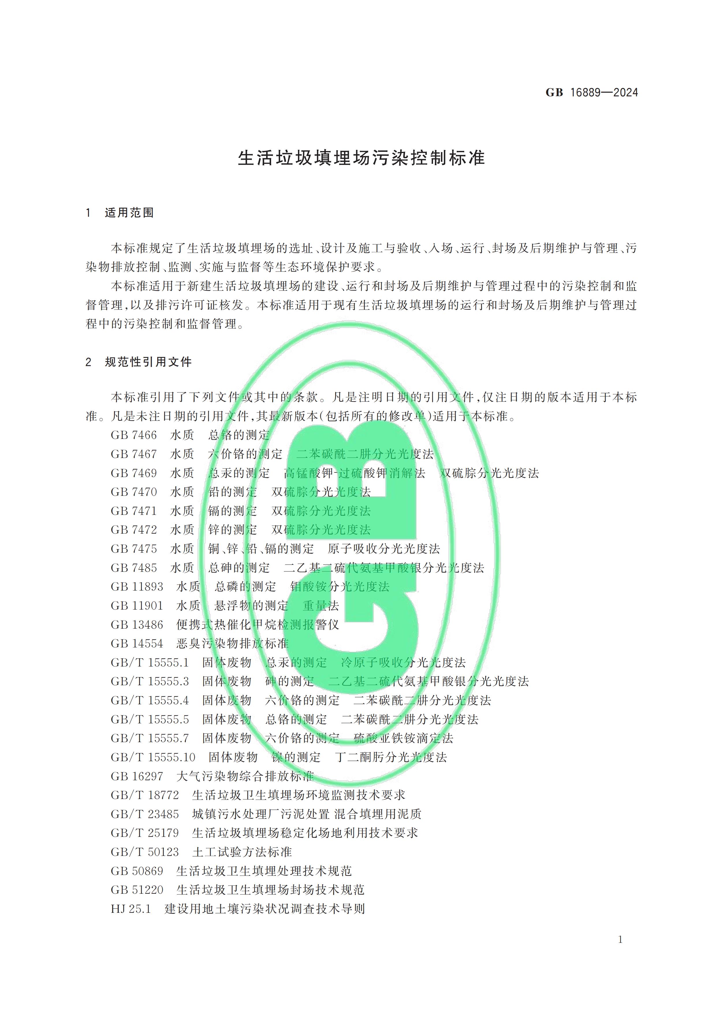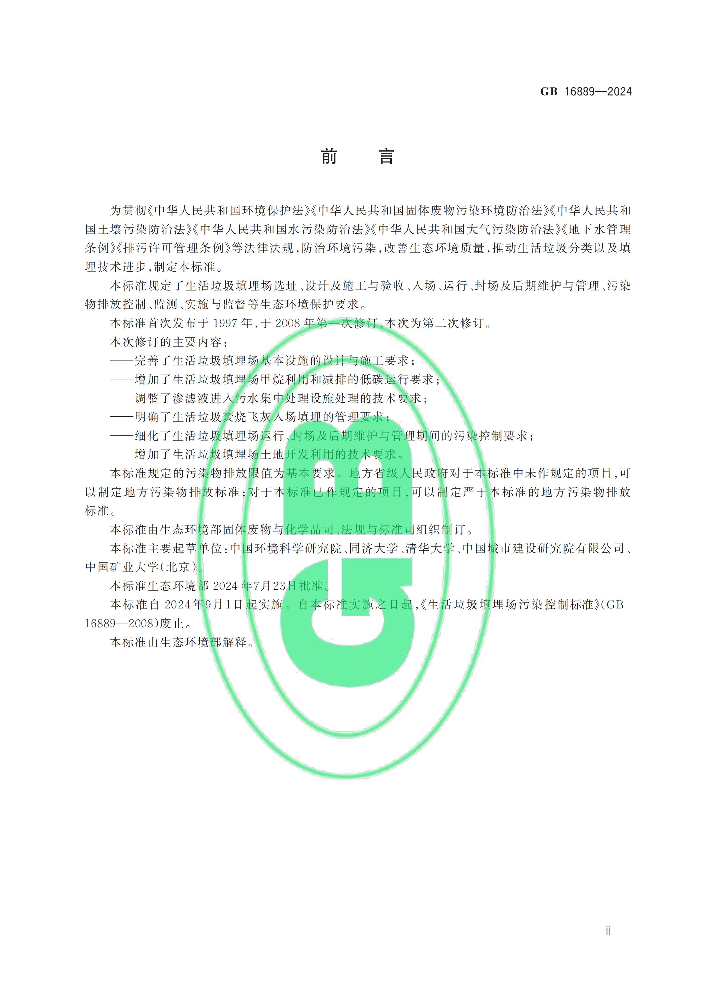 从“全国标准信息公共服务平台”获悉,国家标准《生活垃圾填埋场污染控制标准》(GB 16889-2024)已于2024年7月24日正式发布,新标准将替代原先的GB 16889-2008,于2024年9月1日起正式实施。以下是GB 16889-2024标准全文: