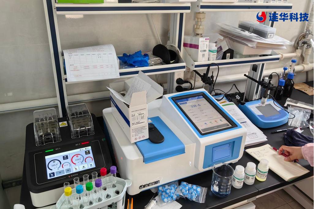 解决办法:连华科技售后工程师抵达客户现场后,经过初步的分析判断,发现水样颜色影响较高,并且COD超过20000mg/L,氯离子也偏高。水样经过稀释后,COD测值稳定,符合误差范围,检测结果为26755mg/L。在进行氨氮检测时,由于有色度干扰,分别使用纳氏试剂分光光度法法和水杨酸分光光度法进行了实验,使用纳氏试剂分光光度法时采用凝絮沉淀法对水样进行了预处理,但检测结果依然波动较大,而水杨酸分光光度法测值相对稳定,水样颜色、干扰物对于检测结果影响较小。和客户协商后采用水杨酸法进行氨氮的检测工作,检测结果为64.88mg/L。在实验过程中,售后工程师分别对水样预处理方法、实验细节、注意事项进行了详细的讲解与演示,以帮助客户快速掌握仪器的使用方法与实验知识。