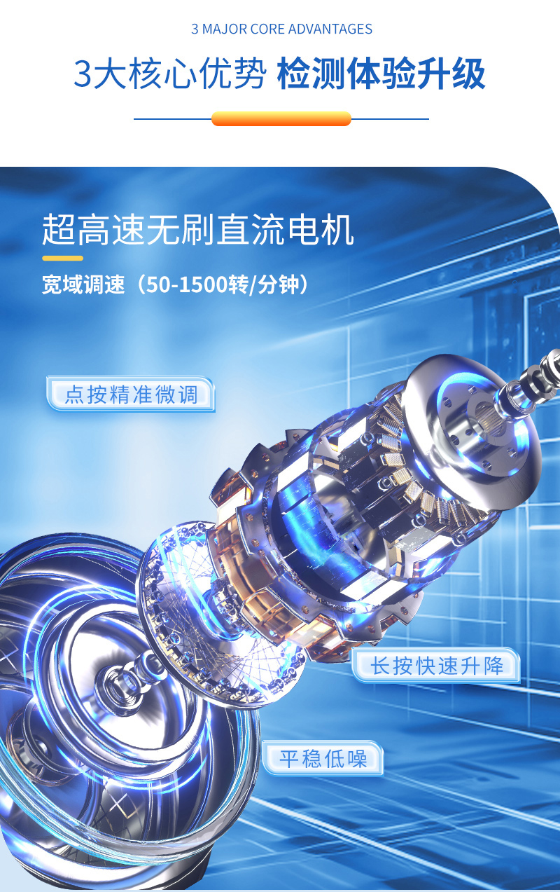 1、强劲动力,无极调速:50-1500转/分钟宽幅调速,点按精准调节,长按快速增减,操作更高效;